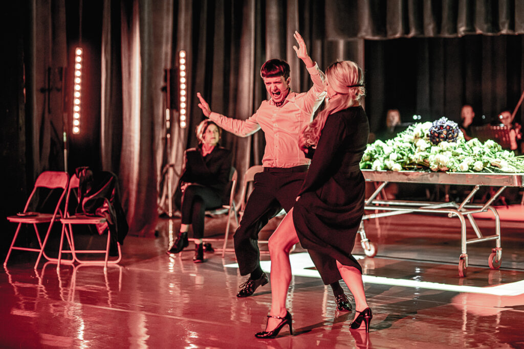 Jej wejście bocznymi drzwiami na widownię rozpoczynało spektakl. Z satysfakcją przysłuchiwała się orkiestrze ustawionej na proscenium przed opuszczoną jeszcze kurtyną (Antraktowa Orkiestra Teatru Polskiego grała na żywo do końca przedstawienia). Lekko rozrzewniona zapewniała publiczność, że wszystko jest tu dla niej: oprawa muzyczna, kwiaty, dzieci, które będą bardzo płakać. Zawieszona w jakimś metateatralnym bardo, uczestniczyła w kolejnych fazach swojego pochówku, komentowała je i reagowała na zachowania bliskich tak, jak robiła przez całe życie: emocjonalnie, domagając się uwagi, pozostawania w centrum, realizowania swojej woli. Ale wpływu nie miała już na nic, co stopniowo zdawała sobie uświadamiać.