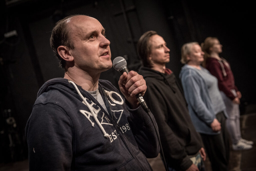 Przedstawienie, oparte na autorskim koncepcie i scenariuszu powstałym w procesie pracy (devised theatre), ma demonstracyjnie minimalistyczny kształt sceniczny: na pustej scenie znajdują się cztery osoby w prywatnych, współczesnych strojach. Na spektakl składają się ich wypowiedzi i rozmowy oraz działania sceniczne o mocno ograniczonej dynamice – przez znaczną część przedstawienia cała czwórka stoi w rzędzie na miejscach zaznaczonych krzyżykami z taśmy klejącej, zwrócona twarzami do publiczności. Trzy z tych osób to bardzo dobrze znane z teatru, filmu i telewizji „gwiazdy” TR Warszawa: Rafał Maćkowiak, Maria Maj i Adam Woronowicz, czwartą jest szerzej nierozpoznawalna w momencie premiery, młoda aktorka Ewelina Pankowska.