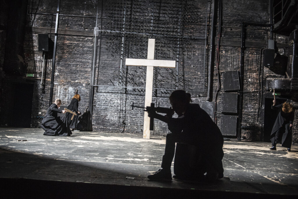 Minimalistyczna scenografia nie naśladuje polskiej wsi sprzed wieku. W ciemnej, niemal pustej przestrzeni pojawiają się tylko nieliczne elementy: prosty drewniany krzyż (w pewnym momencie ścinany piłą mechaniczną przez Karolinę Adamczyk) oraz gipsowa figura przypominająca papieża Jana Pawła II, wjeżdżająca na platformie wyposażonej w kółka, ukazana z wyraźną erekcją doczepionego plastikowego fallusa. Kostiumy stylizowane są na codzienne stroje oraz na sutanny katolickich księży, a trzymane w dłoniach krzyże – unoszone niczym w trakcie egzorcyzmów – łatwo przeobrażają się w karabiny, wymierzone w publiczność w trakcie recytacji modlitwy Ojcze nasz.
