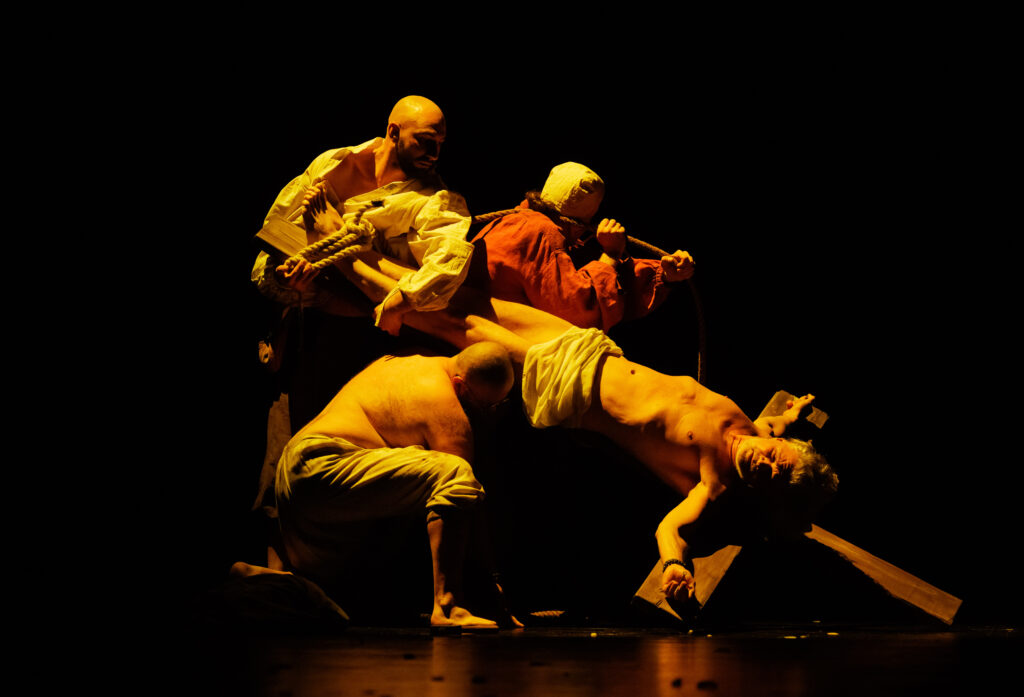 I chyba tylko o zabawę tu chodzi, bo przecież trudno brać na poważnie wygłaszane z nieznośnym patosem rozważania o opozycji światła i cienia (Caravaggio, jako tenebrysta, na symbol dualizmu pasuje doskonale). Drażni również nadrzędna metafora, w której Bóg Ojciec (Artur Święs), Syn Boży (Bartosz Roch Nowicki) i Duch Święty (Dawid Ściupidro) odpowiadają barwom podstawowym, którymi operuje malarz, co zostaje zilustrowane słupami świateł: czerwonym, niebieskim i żółtym i jest tak ładne, że aż brzydkie. Wreszcie nie sposób przejąć się groteskowo wrzeszczącymi postaciami (wziętymi z Biblii, mitów i historii), które cierpią na sto różnych sposobów, a w żaden nie da się uwierzyć. Zaprawdę, wielką wartością malarstwa jest cisza.