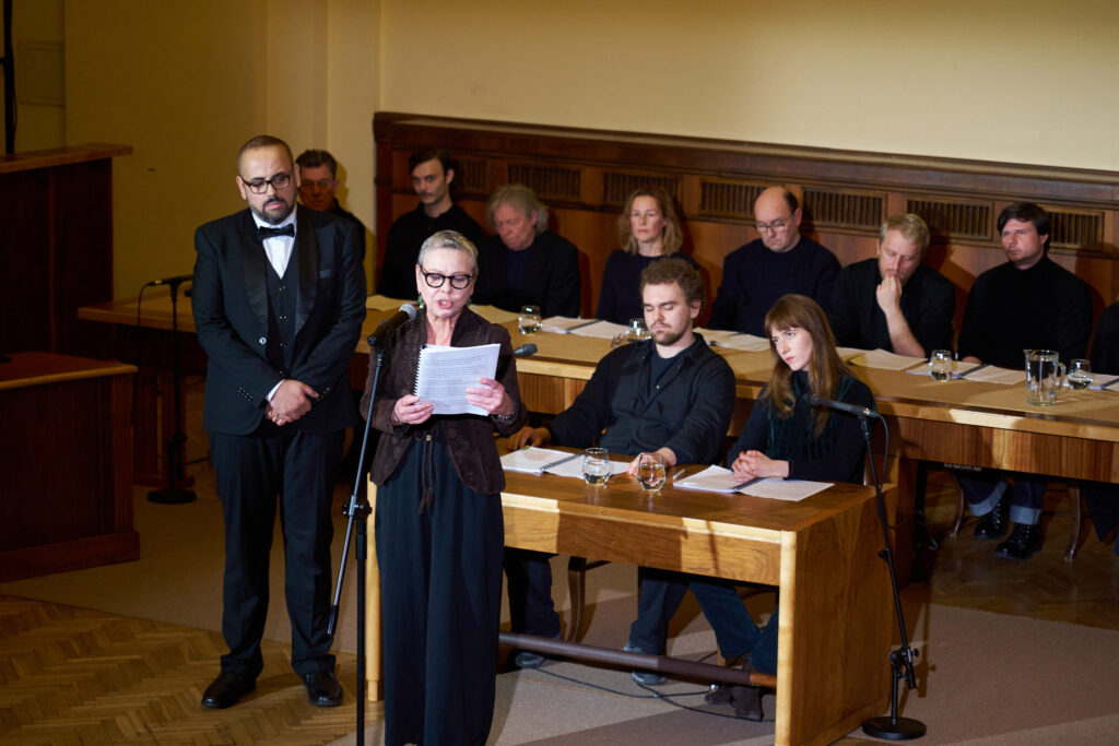 Twórcy naśladują zatem proces sądowy, jednocześnie dając wyraźny sygnał, że ten teatralny toczy się o inne stawki. Czytanie nie buduje dramaturgii na konflikcie racji i wyobrażeń poszczególnych postaci, ale staje się laboratorium społecznej wyobraźni: bada przestrzenie społecznych rozdarć, nieprzekładalności perspektyw. Rau i Dècle w żaden sposób nie relatywizują przemocy seksualnej, jest jasne, że są po stronie ofiary, ale nie dają się ponieść energii czysto aktywistycznej. Sam reżyser w rozmowie z Pauliną Reiter odwołuje się do tragedii greckiej, której celem było postawienie społeczności, tak ofiar, jak i sprawców, wobec przemocy, której doświadczyła. Jak mówi Rau: „Chodzi o to, żeby zobaczyć, jacy jesteśmy”, co ma być „doświadczeniem transformującym”.