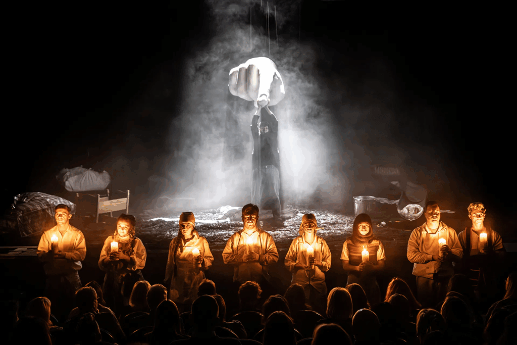 Kostium kostiumem, ale Jolanta Janiczak nie byłaby sobą, gdyby nie dopisała szeregu aktualizacji. Szczególnie irytujące są te odnoszące się do doświadczeń osób pracujących w teatrze. Kochani, wszyscy wiemy, że nie macie łatwo. Wciąż jednak lepiej niż chłopi w latach trzydziestych. Dobrym przykładem strategii swoistego shock value, którą stosują Rubin i Janiczak, jest decyzja, aby przerysowaną historię o teatralnych dzieciach (które celem zbilansowania domowego budżetu kradną jedzenie z premierowych bankietów), opowiedziały córki dwóch aktorek z obsady.