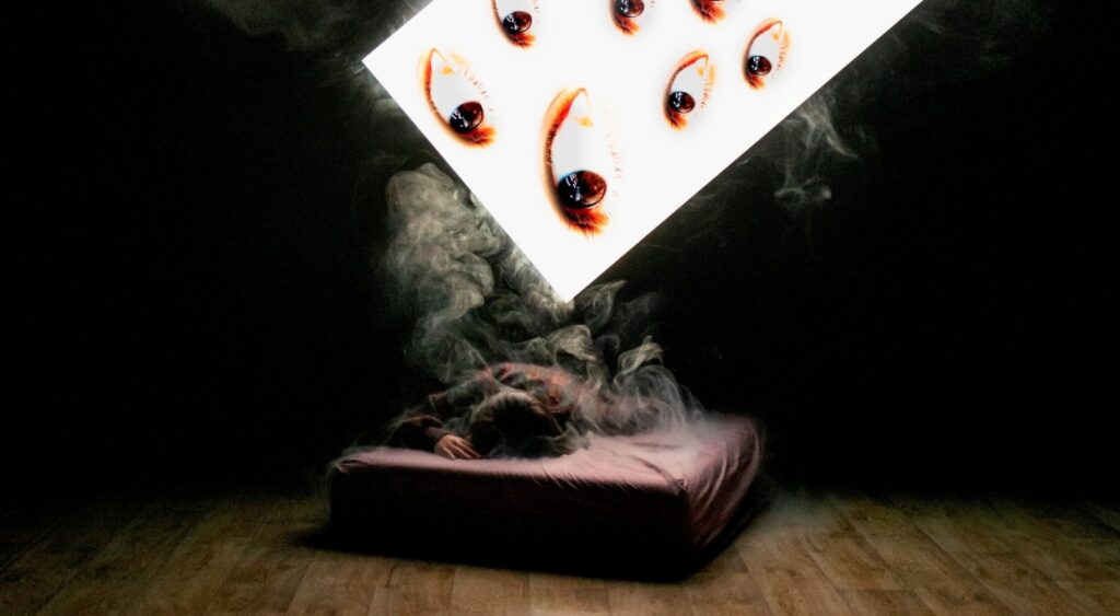 GOSIA WDOWIK: Rzeczywiście to powracający motyw w mojej twórczości. Ukazuje zmaganie się z bezsilnością, którą uczysz się akceptować jako naturalny etap w życiu. W przypadku Wstydu jest to kobieta leżąca z głową w domku. Dosłownie: kobieta przytłoczona domem. Przez cały spektakl sprawdzamy, co można zrobić, żeby ją stamtąd wyciągnąć. W She was a friend of someone else to ja leżę na materacu i z mojego ciała wydobywa się dym. Reprezentuję stan wypalenia się. Staram się nie traktować leżenia jako wstydliwego aktu, którego boimy się pokazać na scenie. Zastanawiam się, jak może być on częścią akcji scenicznej i stanowić punkt zapalny do kolejnych działań. Szukam potencjału. Intryguje mnie, jak w kondycji bezsilności i ciężaru można pozostawać obecnym.