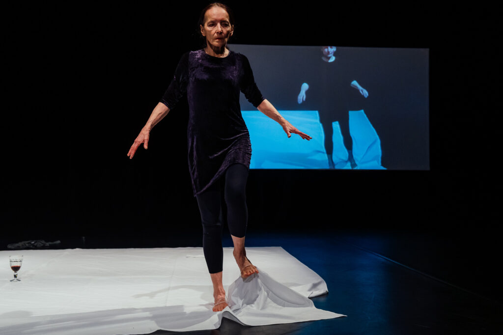 W popremierowym spotkaniu Krukowska mówiła, że w Retrospekcji chciała zmierzyć się ze sobą – kondycją swojego ciała, dyspozycją performerską – sprzed kilku dekad. Efekt jest o tyle zaskakujący, że odsłania nie tyle proces starzenia się ciała czy zmniejszenia sprawności, ile zmianę nastawienia performerki do działania oraz zmianę kontekstu, w którym to działanie się odbywa. O ile Krukowska z 1994 roku wydaje się odnosić przede wszystkim do sfery symboli i niewypowiedzianego wprost własnego doświadczenia, o tyle Krukowska z 2026 roku odnosi się przede wszystkim do siebie samej, do swojej ścieżki twórczej, swojego ciała. Siła tej propozycji wynika z gestu umieszczenia w centrum uwagi kobiecego performansu i jego archiwum, ale też z relacji, jaką performerka ustanowiła ze współautorką Retrospekcji. Najlepiej ową relację opisuje słowo „towarzyszenie”. Szczawińska i Krukowska towarzyszyły sobie w podróży w przeszłość, w twórczym przetwarzaniu materiału z archiwum, ale i na scenie Komuny. Na nagraniu z 1994 roku Krukowska jest sama. W wykonaniu z 2026 roku towarzyszy jej Szczawińska. I nie jest to żadna metafora międzypokoleniowej przyjaźni ani harmonijnej współpracy, ale konkretne działanie, współ-działanie.