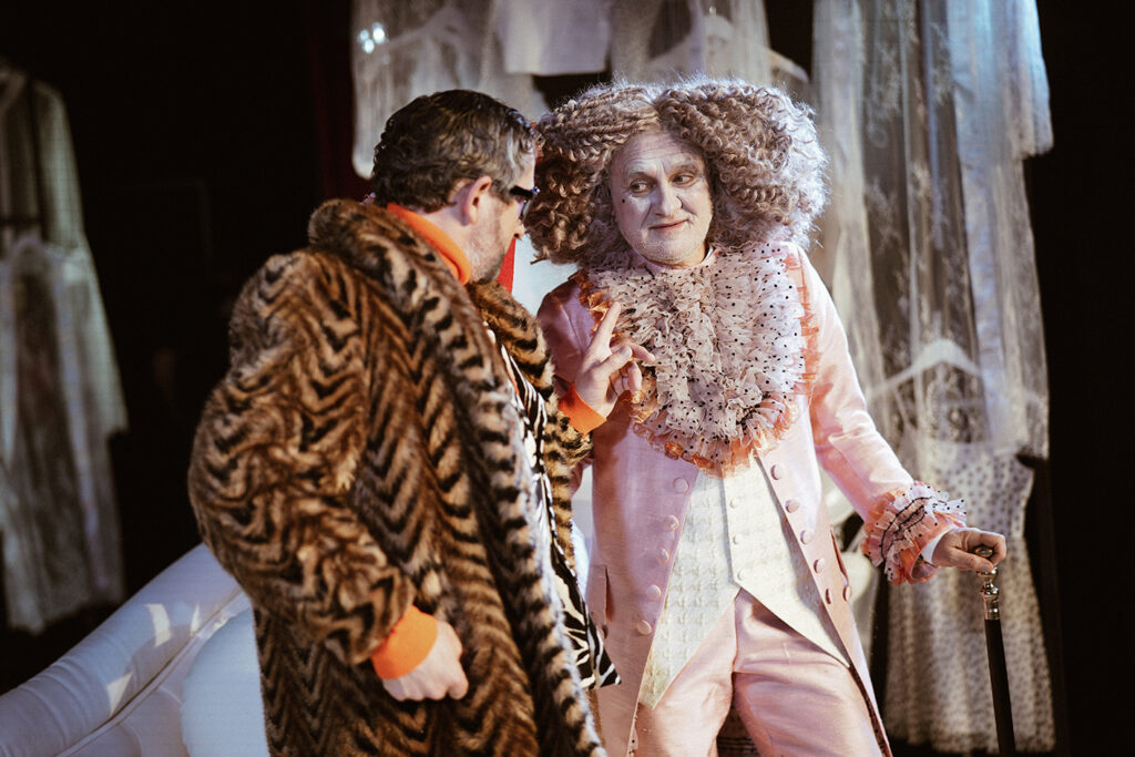 Ktoś powie: przecież Porwanie Europy to farsa w krzywym zwierciadle. Przemyślna zabawa z tym, co proste, głupie, przaśne i w złym guście. Pasują więc zarówno toporna scenografia (dominują stelaże, które robią za ściany obwieszone ślubnymi sukniami i bielizną), jak i kostiumy (peruki, sztuczne wąsy, gorsety, kalesony i tym podobne), za które odpowiada Aleksandra Reda. Podobnie pozbawione niuansów światło (Jędrzej Skajster), muzyka (Antoni Wojnar) i wreszcie aktorstwo. Szeroki gest, wyraźny grymas, szarża za szarżą.