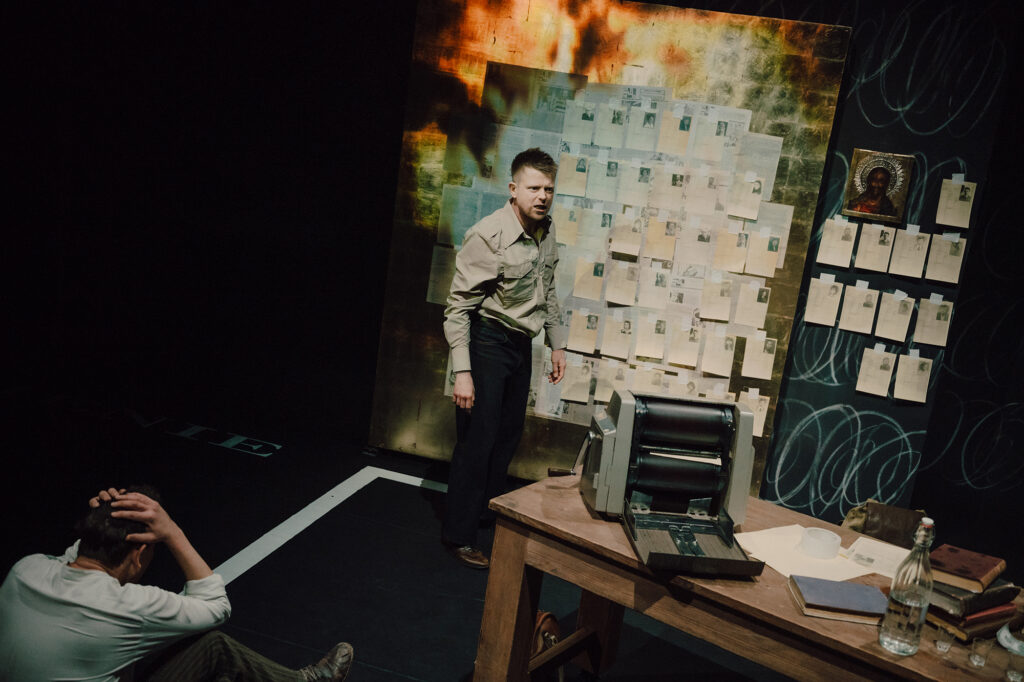Scenografia Justyny Łagowskiej bardzo zawęża pole gry. Scenę zamyka masywna ściana, która zagradza dostęp do horyzontu. Trochę to przypomina ikonostas, tyle że wrota, które się otwierają w tej ścianie, nie prowadzą do transcendencji, ale do więzienia. Co prawda na odwrocie jednego skrzydła mamy zestaw ikon, a drugiego – tapetę z ulotek, a więc bohaterowie pozostają w wymiarze wiecznym i doczesnym jednocześnie. Kobieta w białej sukni to tyleż anioł stróż, co Marsylianka, uosobienie „myśli” przechodzącej z pokolenia na pokolenie. Ściana okalająca drzwi jest nieruchoma, ornamenty wyraźnie dzielą ją na pół, po lewej wertykalne grube linie, po prawej poziome spirale. Czyżby to umocnienia na naszej wschodniej granicy – bariera i concertina – a rzecz jest o powtarzalności historii (zwłaszcza gdy za sąsiada ma się Rosję)?