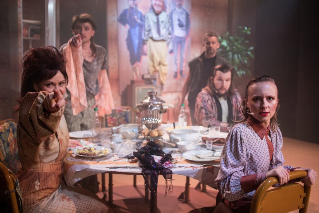 Na pewno nieźle, gdy idzie o żwawość i atrakcyjność widowiska. A sens? Młoda i już wzięta reżyserka Pamela Leończyk najwyraźniej nie miała ochoty po raz kolejny historycznie rozliczać transformacji i wycierać butów o portret Balcerowicza. Zobaczyła swoich bohaterów wyjętych z Wujaszka Wani i przemacerowanych przez Demirskiego jako tych, którzy właśnie nie dają się zapędzić do turbokapitalistycznego wyścigu szczurów. Zrobiła z nich bardziej nonszalanckich anarchistów niż ofiary przemian. Umieściła wraz ze scenografką Magdaleną Muchą w nieoczywistej przestrzeni starego mieszkania z nakrytym obrusem wiekowym stołem (ustawionym na miniobrotówce i kręcącym się niczym karuzela), ze starym, czarno-białym telewizorem i z klozetem wyniesionym schodkami ponad podłogę, niczym sedes tronujący. Obok stanął także baner reklamowy szczęśliwej rodzinki z roześmianą facjatą stereotypowego człowieka sukcesu, stołecznego profesora, który dawno stąd wyjechał, ma w tyłku „ubogich krewnych”, może zresztą już nie żyje (mówi się o tym, ale bez konsekwencji, w kolejnych scenach).